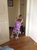 We have spent the morning with you opening presents and laughing as you push your brand new pram around the house, saying “Herro!” each time you enter a room and “Buyeee!” as you leave it. Your Dad is still convinced that a pram is most definitely a girl’s present and so is “hurrumphing” in the corner as he watches you have so much fun with it, but it is most definitely THE present of your birthday (see, Mummy really does know best – remember that!). If we dare take you away from it, even to take you to MacDonald’s for lunch, we are met with howls of sheer outrage. “It is MY pram and I am PLAYING with it – GO AWAY!” It really is quite adorably funny.