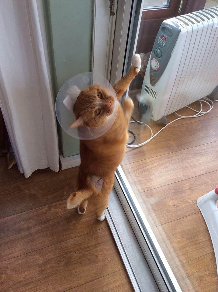 To further add to the indignity, They Who Must Not Be Named, then conclude their practice sessions by placing a large plastic funnel around my neck, wind a strip of cloth around my throat to ensure I cannot remove said item of torture, and then notify you that I must not be allowed out side for ten days hence! Human, it is in my nature to expect freedom of movement outside of the residence, at all hours of the day and night. Confinement is absolutely NOT acceptable. I have notified you of my opinions on this particular matter in reasonably loud tones on a regular basis, and yet you do not appear to be getting the point. I do understand that your intelligence is infinitely inferior to my own, but at some point the message must get through.