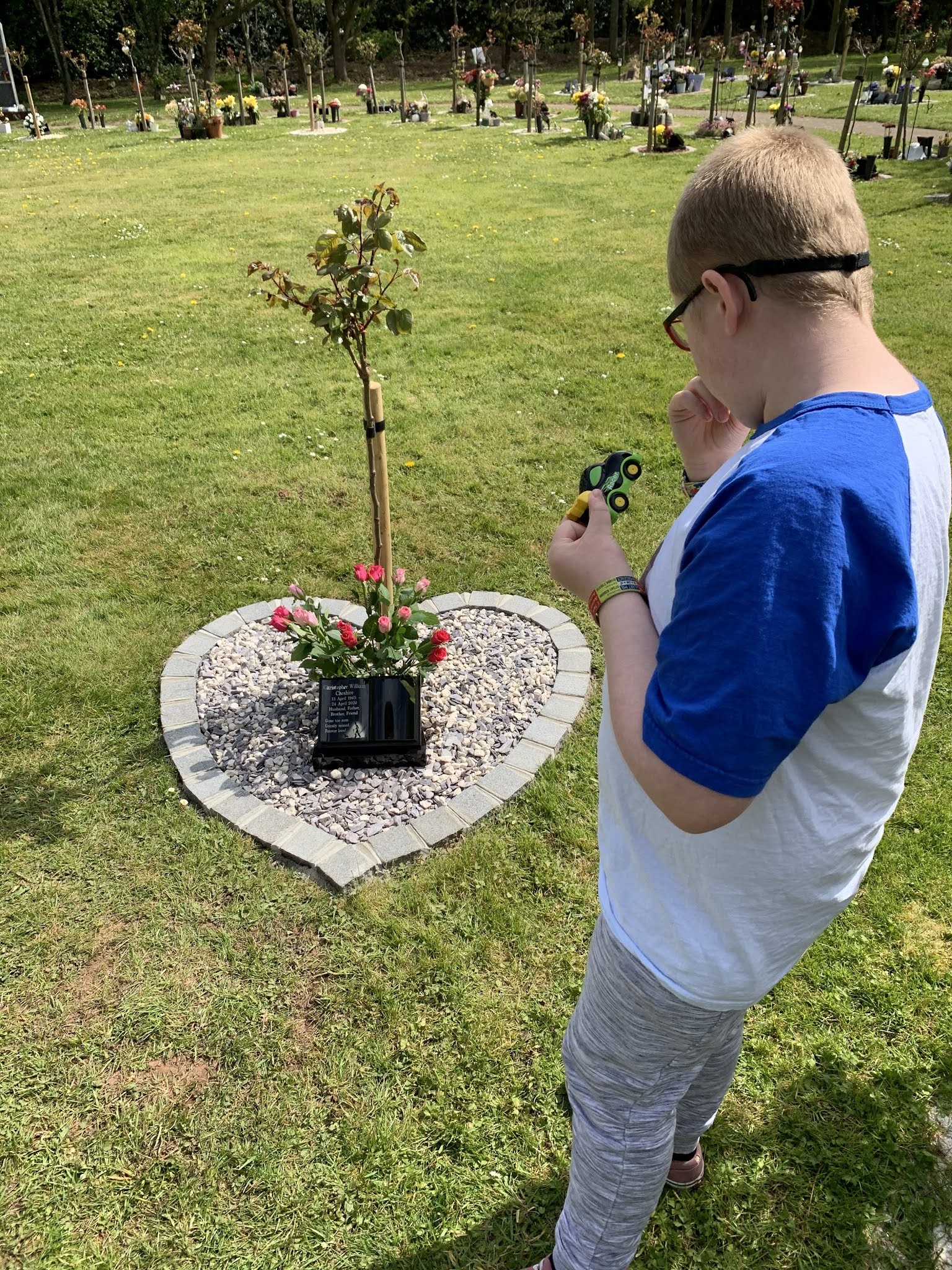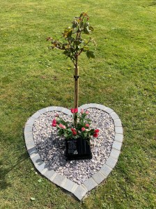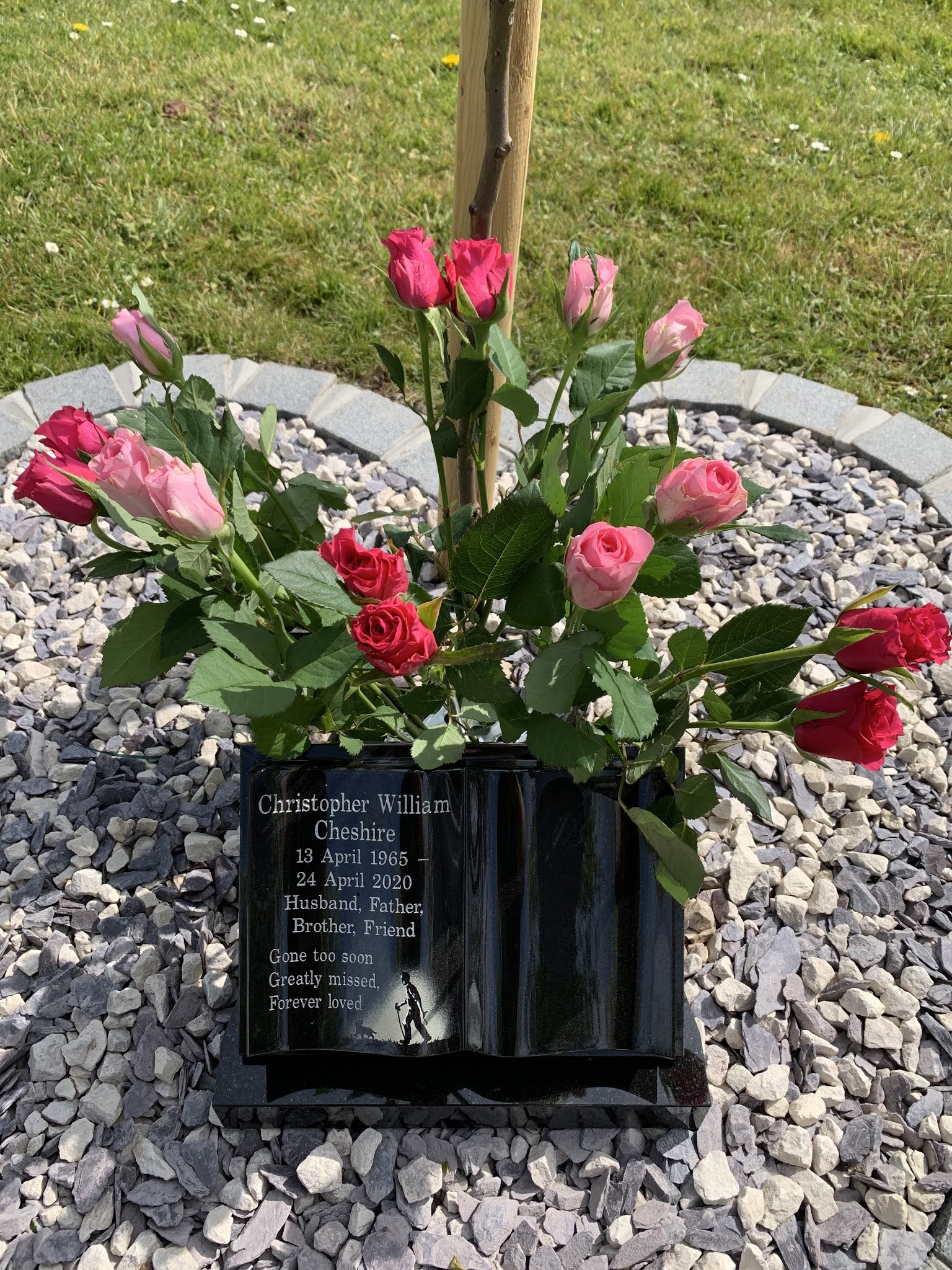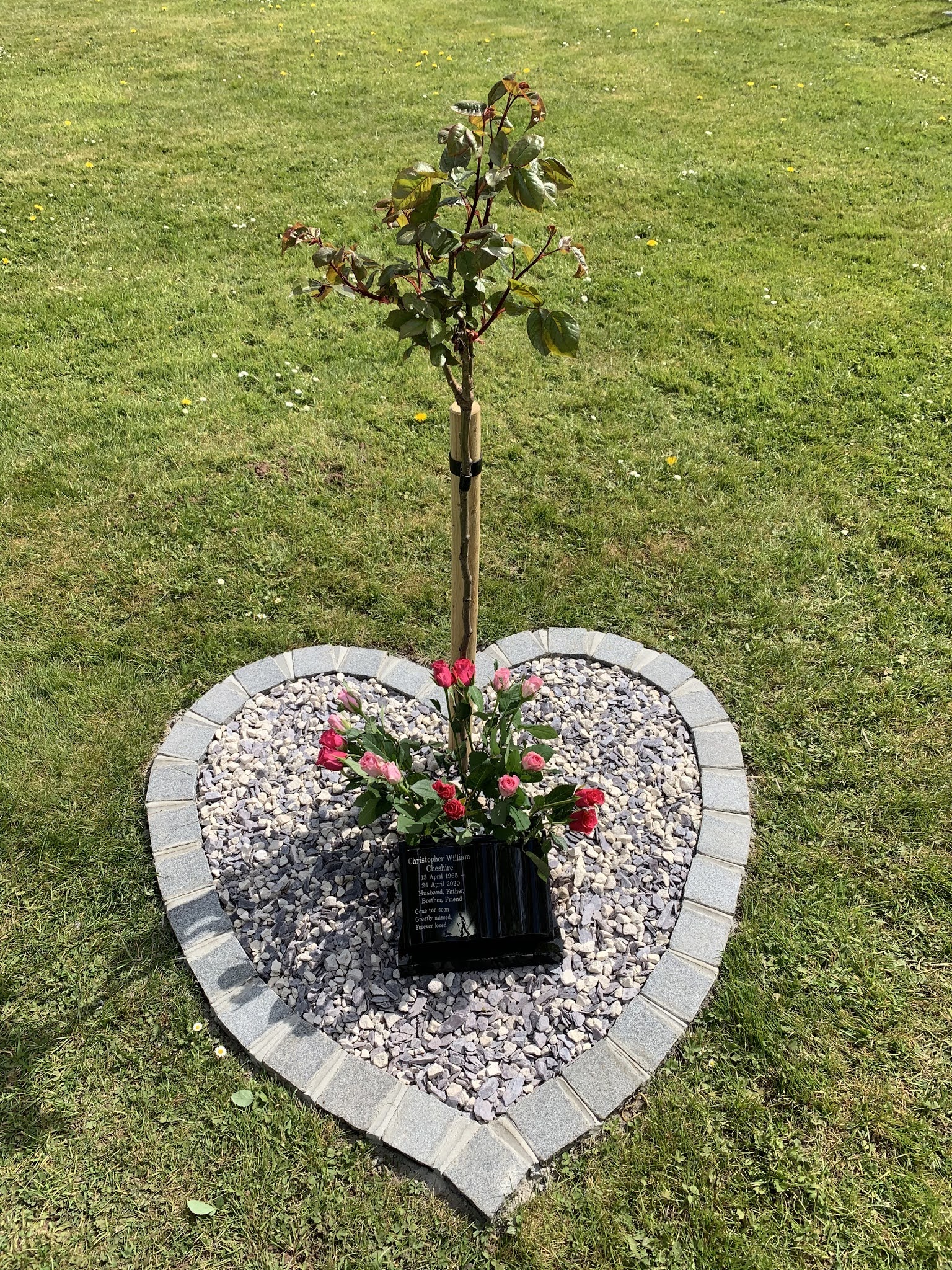 But today, thinking he might cope a little bit better if we went on our own, I took Adam to the shop where he chose “PINK!!” Flowers for Daddy and we went back to the crematorium. I looked at the stone and the tears flowed. I can’t quite believe it’s been a whole year. In a strange way, it seems both forever ago and also yesterday. I also can’t quite believe that my 6’6” giant of a husband has been reduced to a small, heart shaped garden and a foot square marble memorial stone.