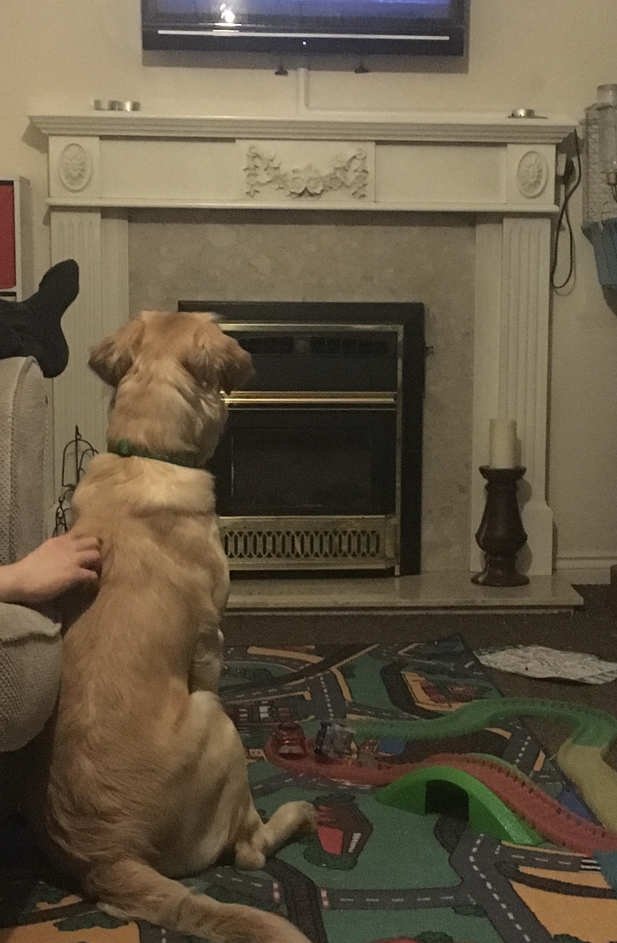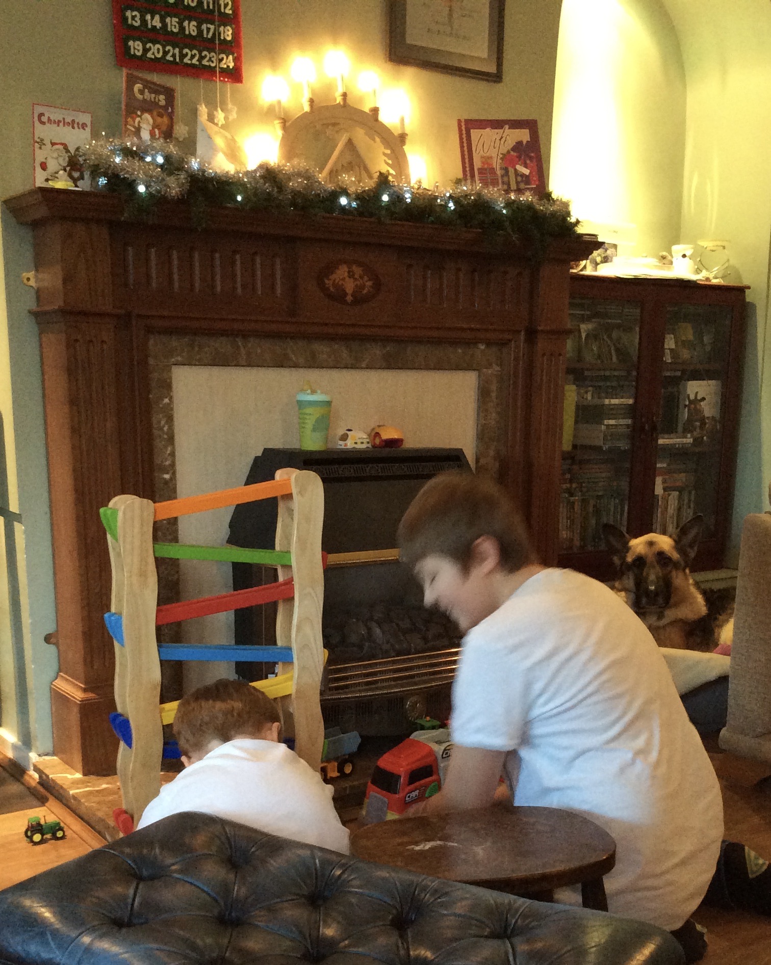 To be sure, there is one candle on the floor to the right of the image, but it’s made of heavy, unbreakable wood. There are 3 tea lights on top of the mantlepiece that had probably been lit after Adam had gone to bed the night before, but nothing else, no other decorations. While you can only see the bottom of it, the TV is mounted on the wall above the mantlepiece because at the height Adam was then, he couldn’t reach it to overturn or smash it – by this point, TVs were already excluded from the ‘accidental damage’ part of our insurance policy as we had claimed for replacement of about four after Adam had thrown toys into the screen. Also, all of the cables are contained in trunking or otherwise fixed down, there is very little that can be grabbed or tugged.