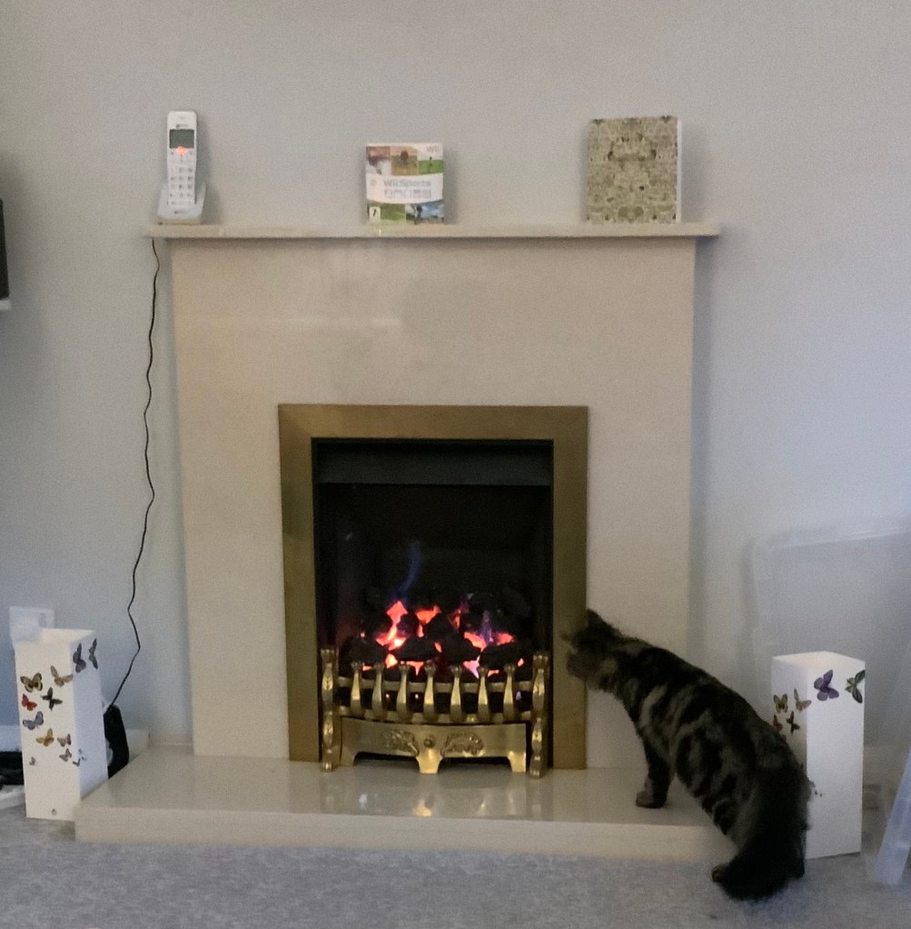 Those lamps you can see on either side of the mantelpiece that are decorated with butterflies were made of paper and virtually indestructible, having been bought for that reason. The very stupid cat was just a bonus…thankfully despite multiple efforts, he’s never yet lit himself on fire!