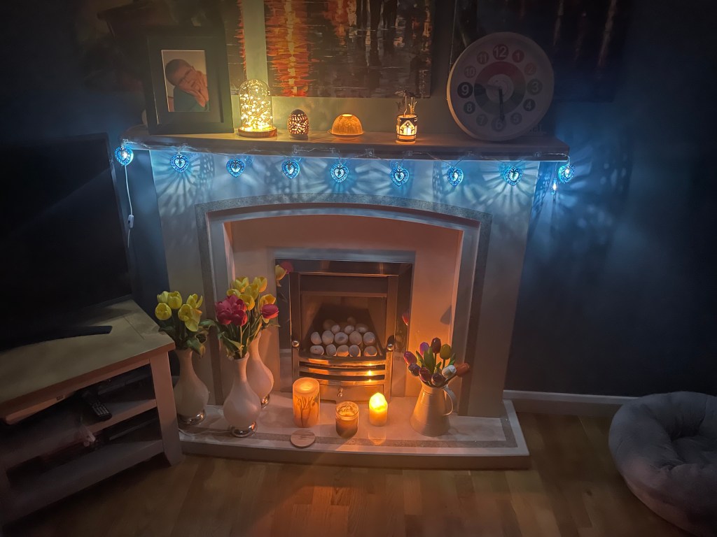 There are lit candles, fragile glass and china ornaments, fairy lights, a glass fronted photo of my boy and yes, the plastic and wooden tulips still remain, but this is now an eminently breakable fireplace and mantlepiece…and it’s ok. It no longer has to be anything other than what I wanted it to be and how I want it to look. This seemingly innocuous photo represents healing, moving out of survival mode and rebuilding my life. This fireplace represents choices and it still tells the story of my family and my home.